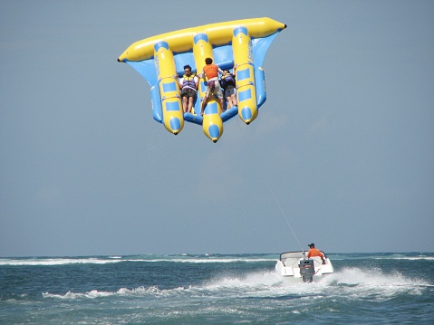 - Parasailing adventure dapat diikuti oleh dua atau tiga orang. Jika Anda ingin menaiki parasiling bersama keluarga pada parasut yang sama, pilihlah parasailing adventure. Peserta akan terbang dari speedboat dan mendarat di speedboat pula.